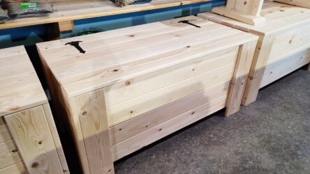 Puidust kirst, valmistatud töötlemata puidust. Kirstu kaanel on metallist hinged.